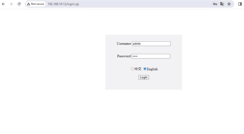 Logging into the switch, the first thing one notices is that the management IP is 192.168.10.12. Once going there, the default is Chinese, but then one can select English to change the language.