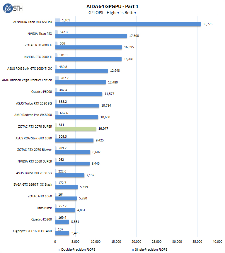 Here, the AMD Radeon Pro WX8200 and ASUS Turbo RTX 2080 cards beat the Zotac GeForce RTX 2070 Super Twin Fan by 6-8% on single precision. The AMD card is more than twice as fast on the double-precision side.