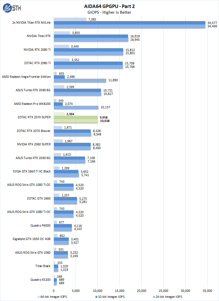 The take away here is the Zotac GeForce RTX 2070 Super Twin Fan performs almost at RTX 2080 rates. The AMD Radeon Pro WX8200 also falls behind in the 64-bit and 32-bit integer IOPS.