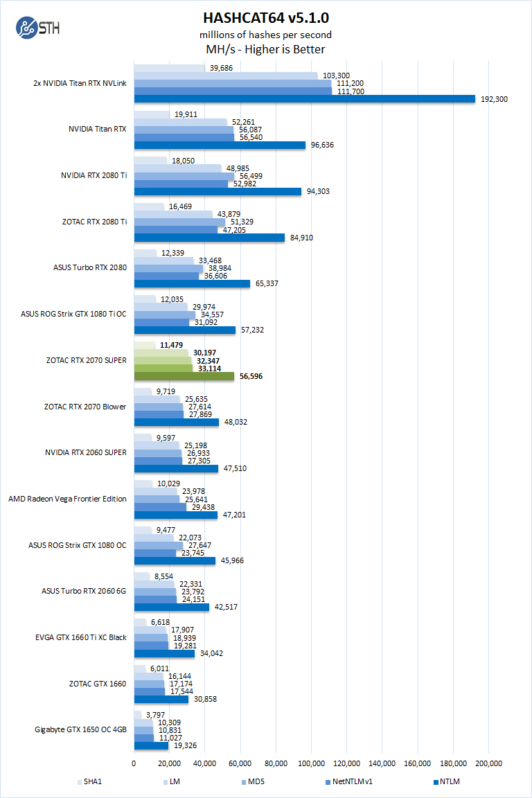 Hashcat64 is a demanding benchmark which heats up GPUs. Here we see the Zotac GeForce RTX 2070 Super Twin Fan fall were we would expect it to after seeing our results from previous tests.