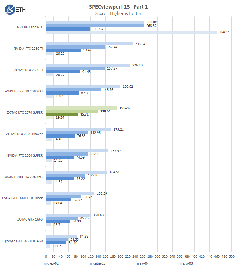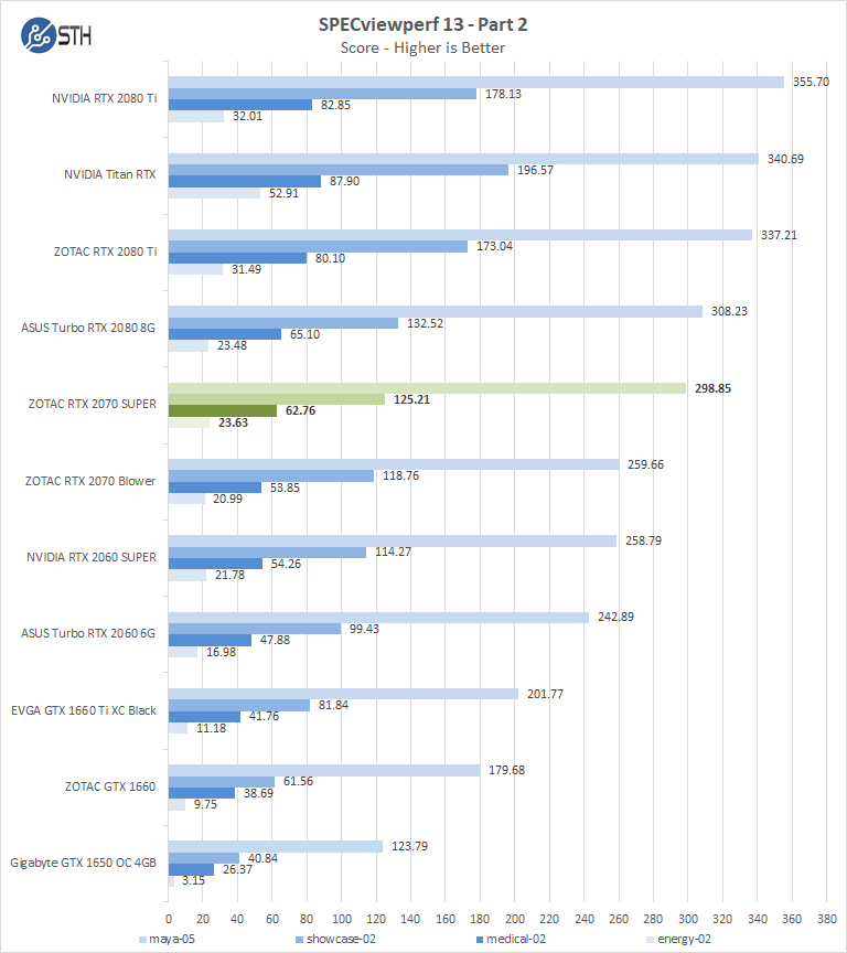 With Luxmark results, we find the Zotac GeForce RTX 2070 Super Twin Fan just passing the ASUS Turbo RTX 2080 8G which is a Blower style card, in this benchmark we see only a slight edge over the NVIDIA RTX 2060 SUPER.