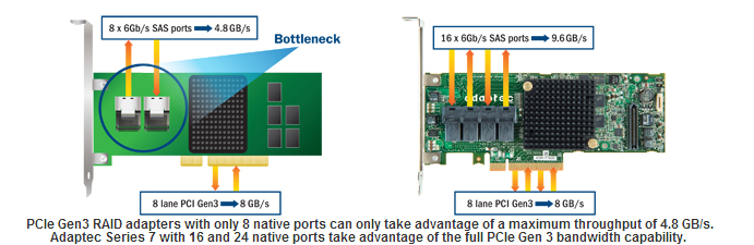 As one can see, Adaptec is offering both 8 port and 16 port HBAs. Adaptec 7H and 7He HBAs use the newer SFF-8643 (internal) and SFF-8644 (external) SAS cabling. These will replace SFF-8087 and SFF-8088 cables respectively with the 12gbps generation of SAS devices. We have already seen one 16 port HBA from LSI with the SFF-8644 cabling in the LSI 9202-16e that we reviewed and benchmarked. Adaptec maintains that using 16 port HBAs allows more effective use of a PCIe 3.0 x8 slot because an 8 port 6.0gbps HBA cannot saturate the PCIe 3.0 interface.
