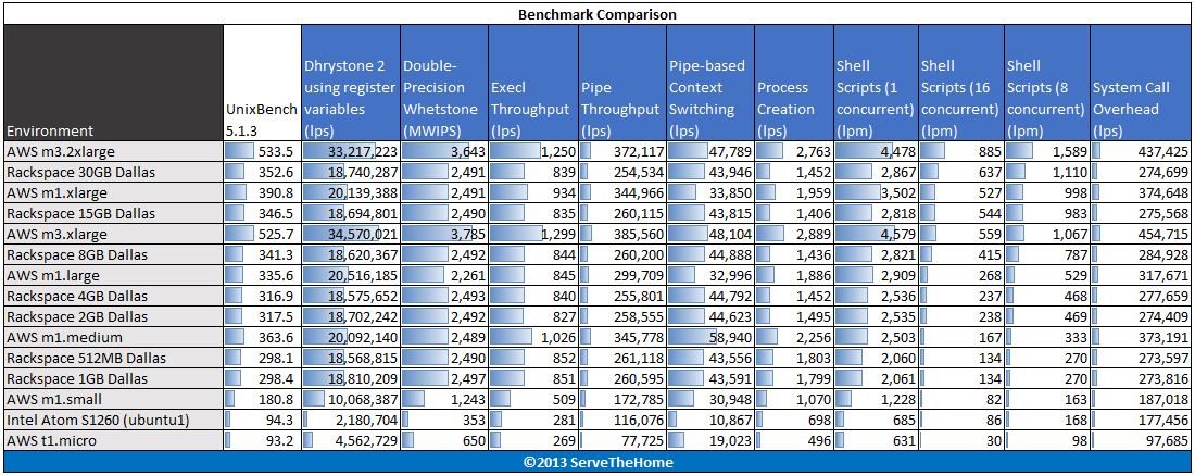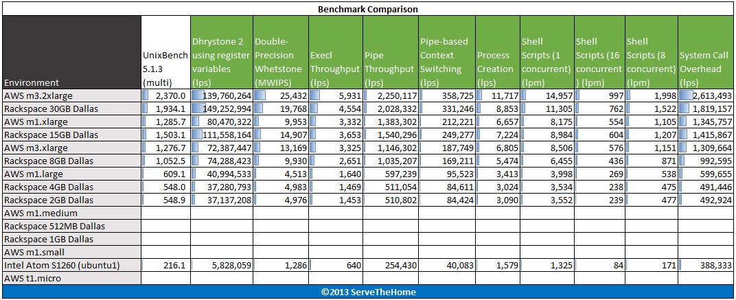 Overall, there are two trends emerging. First, it is clear that Rackspace and Amazon are benchmarking their instances and pricing accordingly. Prices stay relatively close for each performance tier between the Amazon EC2 cloud and the Rackspace cloud. Moving beyond that distinction, the other major trend is that the Amazon EC2 second generation compute instances are generally significantly faster than the first generation instances. A final food for thought to readers, the results for dedicated server hardware is what generally pushes bars lower. The Intel Atom S1260 is a low power low cost compute node. Moving up to the dual socket and single socket Intel Xeon and AMD Opteron range is the force behind the data bars being so low. Stay tuned for more results but the above will be our cloud computing baseline to compare against dedicated hardware.