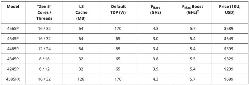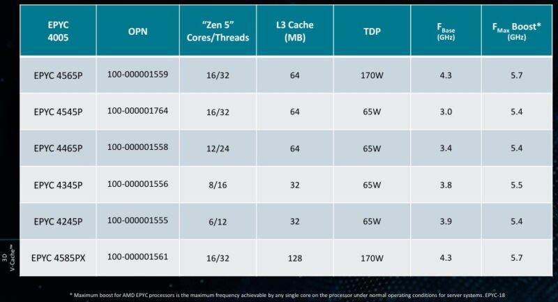 With the AMD EPYC 4005 SKU stack, there are now only six parts. Two at 170W TDP for high-performance 16-core setups. Then there are four 65W SKUs designed for lower-power computing. In all cases, however, the clock speeds are at least 3.0GHz as base, and over 5.4GHz at their maximum boost levels.
