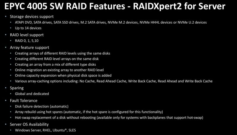 Another difference between the EPYC series, and the Ryzen series, aside from the obvious ones like having a 16-core 65W TDP SKU, is that AMD EPYC means we have validation work for server OSes like Ubuntu and Microsoft Windows Server. We also have the validation work to support ECC UDIMM memory. This is not just a certain motherboard manufacturer offers ECC that they are supporting themselves with a Ryzen part. This is the entire line supporting ECC memory from AMD to the OEM. AMD also has the RAIDXpert2 for Server which is the software RAID solution. This matters for some segments if you need to have RAID for Windows Server as an example. Some still add RAID cards, but every generation PCIe-based RAID controllers continue to lose share when we ask OEMs.