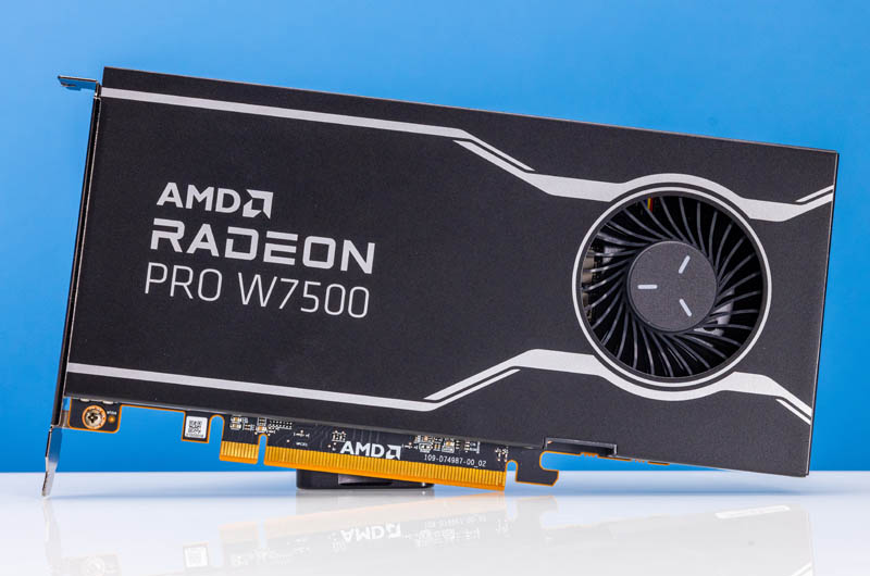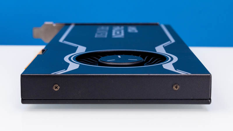 Here is the front of the card. While it is still full height, it is also shorter and the fan does not pass through the card like it does on the AMD Radeon Pro W7600.