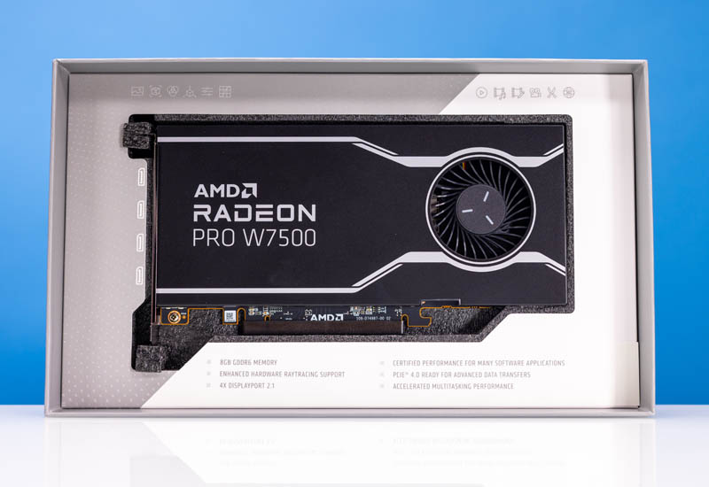 These cards arrived too late for our full review process to happen before the embargo, but we managed to edit the photos of the card. First, here is the AMD Radeon Pro W7600 and key specs inside the box: