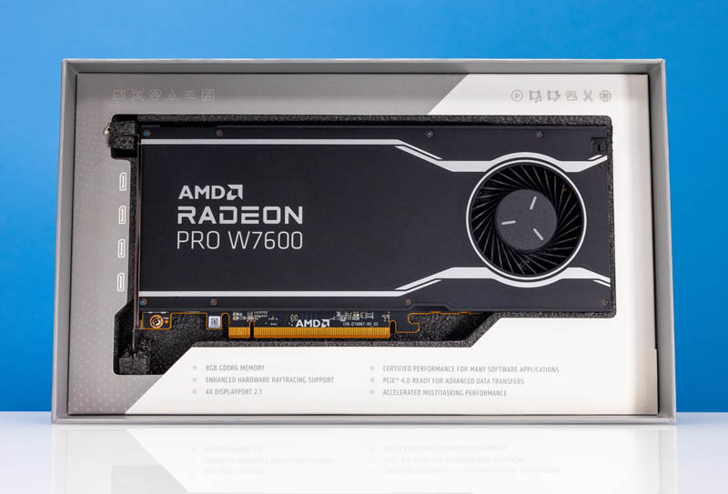 Opening that, we see the AMD Radeon Pro W7600 and key specs inside.