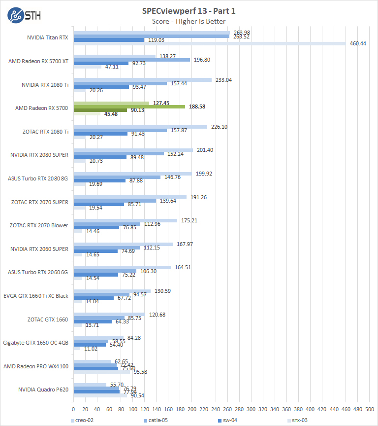 With SPECviewperf we see interesting results, in parts of this benchmark the AMD Radeon RX 5700 has excellent performance but falls considerably in others like Maya, SNX, and CREO where the Pro cards would be better. We find performance of the RX 5700 here between the NVIDIA GeForce RTX 2080 and the RTX 2070.