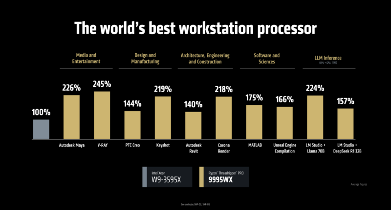 For the moment, at least, AMD is facing limited competition in the HEDT and workstation markets. Intel has yet to announce any new workstation/HEDT parts based on their Granite Rapids (Xeon 6) server hardware, so Intel’s current lineup is their existing Sapphire Rapids-based Xeons. A lack of CPU cores already put those chips on the backfoot against Threadripper 7000 when it came to CPU-bound workloads, so Threadripper 9000 should widen this gap.