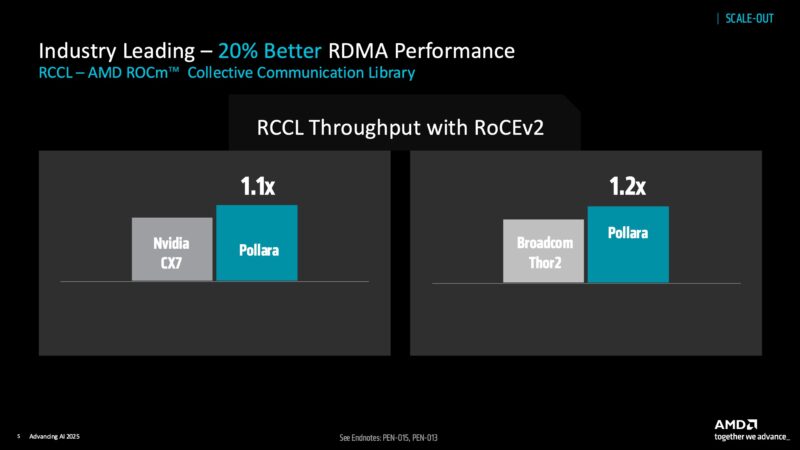The AMD Pollara 400 is the 400G device (really for PCIe Gen5 platforms) that incorporates UltraEthernet. When using AMD’s version of NVIDIA’s NCCL, called RCCL for scale-out collective communication, AMD says that it is faster. That means faster than NVIDIA ConnectX-7 by around 10% and around 20% on the Broadcom Thor2. This is a big deal since that communication can cause GPUs to idle if it is inefficient, making the overall workloads run slower. NVIDIA would be quick to highlight its Spectrum-X benefits with its GPUs, but this is the AMD ecosystem.