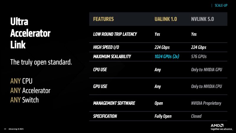 AMD is going to use UALink 1.0 to handle its scale-up. This is the open alternative to NVIDIA NVLink 5.0 and AMD says that it can scale almost twice what NVIDIA can but also integrate components from mutliple vendors.
