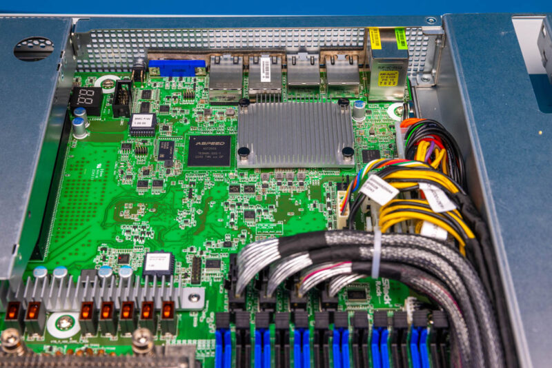 AMD socket SP5 and the EPYC 9004 Genoa, Bergamo, and Genoa-X CPUs have so much connectivity that everything is connected to the CPU. The E1.S bays use the motherboard’s MCIO connectors. The PCIe Gen5 riser and OCP NIC 3.0 slot can get full x16 bandwidth because they each have a Gen5 x16 root.