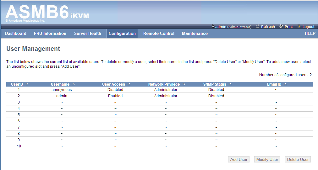Users can be added and enabled/ disabled as needed. Roles can be assigned. Again admin / admin is default.