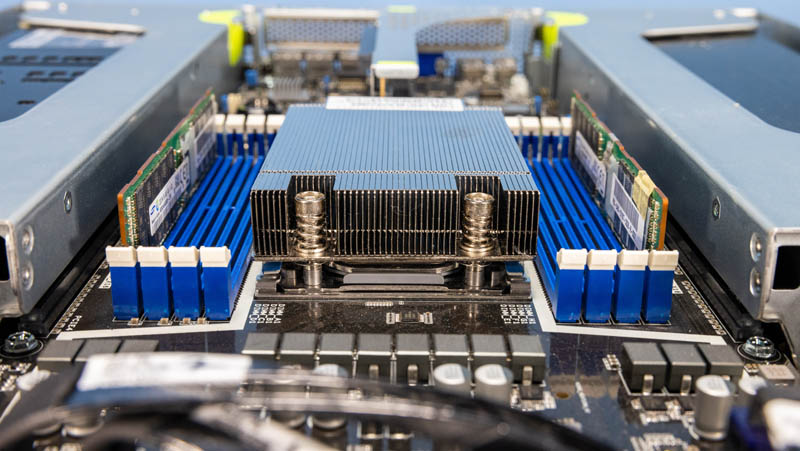 The memory situation is interesting. There are a total of 8x DDR4-3200 slots. Our system came installed with two 32GB DIMMs for 64GB, but we would deploy it with 256GB or more of memory and all eight memory channels filled. Luckily we have an extensive spare parts bin.