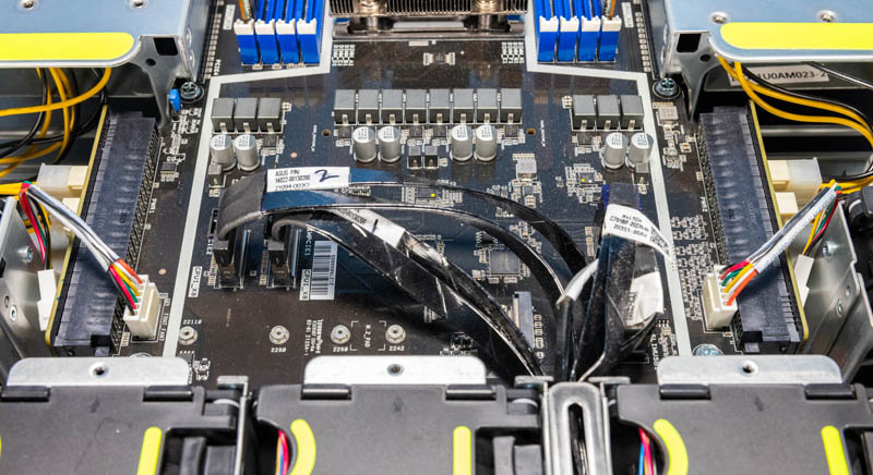 Behind the fan partition, there is the main PCIe and power distribution area. One can see the PCIe cables leading to the front of the chassis. power is distributed to the system and the GPUs via the side edge connectors. Under the sea of black cables, one might be able to spot the M.2 connector close to the fans. There is a single onboard M.2 slot capable of up to M.2 22110 size drives.