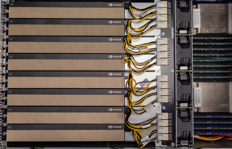 These are NVIDIA A40 GPUs. As 300W 48GB Ampere GPUs, they would have been part of the Quadro line in years past. Now, they are simply marketed as the NVIDIA A40, but that is why these are passively cooled GPUs with display outputs.