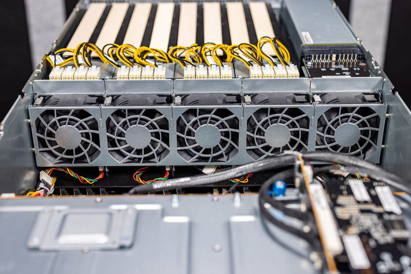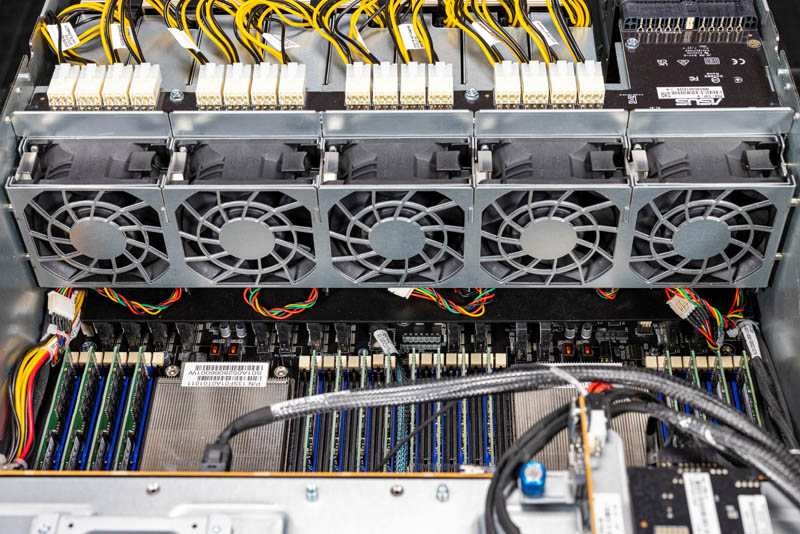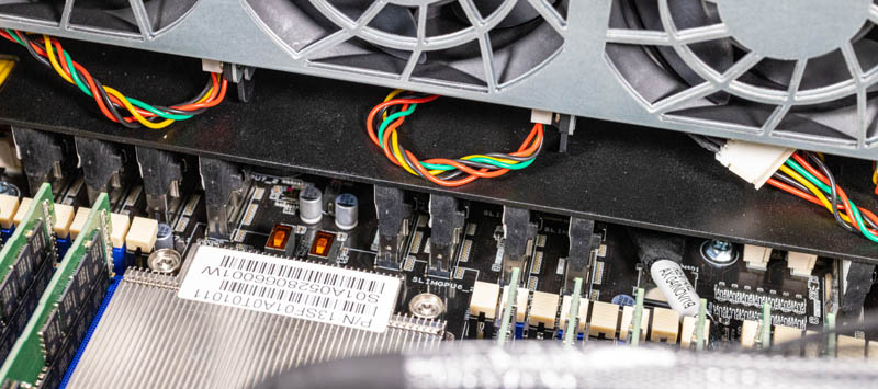 All of the PCIe slots, both for the GPUs and also for NICs/ storage are handled via cabling. So behind the CPUs and memory, we have a large number of PCIe cable headers.
