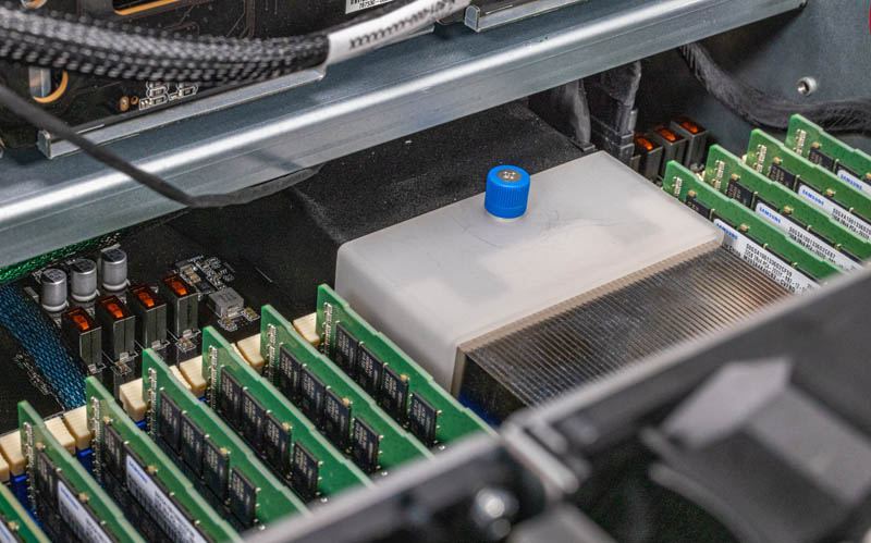 Along with the two AMD EPYC CPUs, we get 32x DIMM slots. We have 16x 32GB DIMMs here, but one can fit up to 32x 256GB of memory for 8TB total.