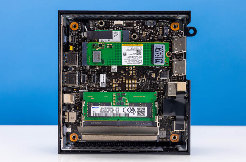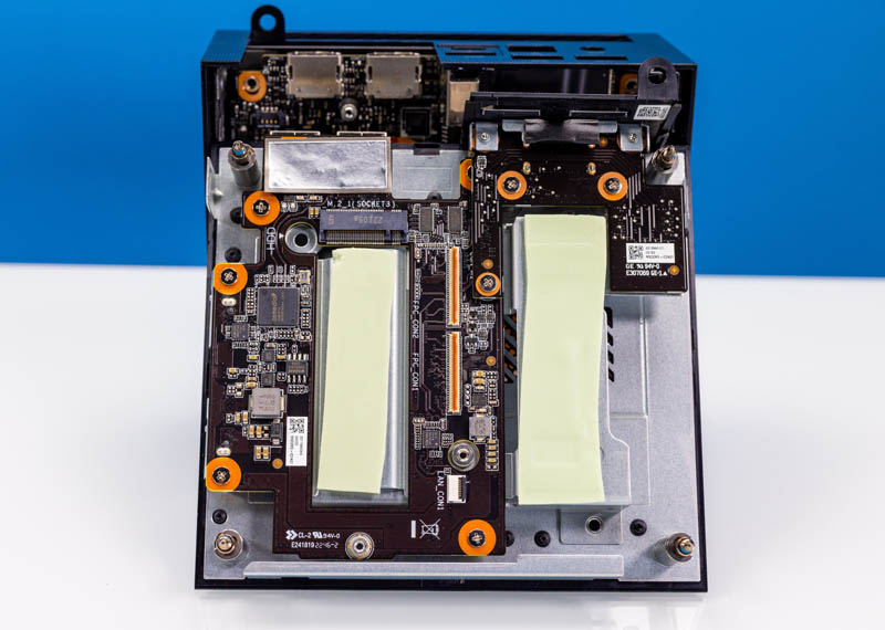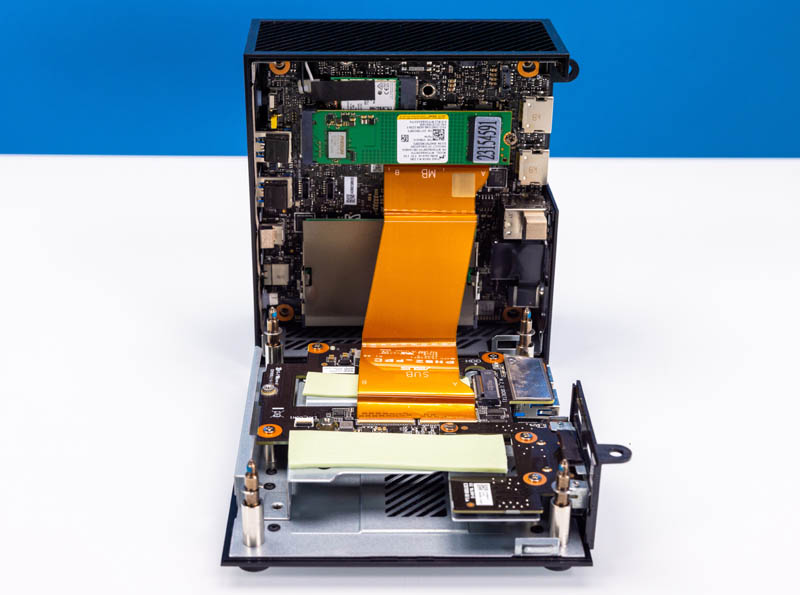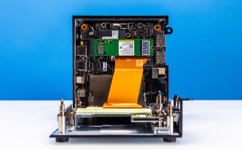Opening the system, we can immediately see that this is not a single PCB solution like many mini PCs. Instead, the bottom has storage, including a 2.5″ drive slot.