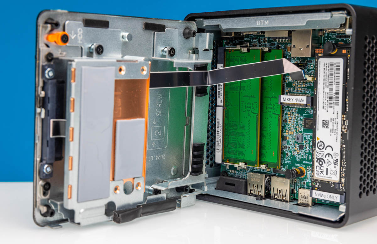 Pulling the bottom cover away, we get features on that bottom cover. There is a 2.5″ SATA hard drive/ SSD slot since we have the tall chassis. That is the reason for the ribbon cable. We then get a little heatsink assembly for the NVMe SSDs.