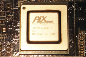 The ASUS P8Z77 WS motherboard perhaps shows how an ATX Ivy Bridge board’s PCIe slots should be done. There are four PCIe Gen3 x16 slots and two PCIe Gen2 x1 slots. The Ivy Bridge (and Sandy Bridge) LGA1155 CPUs only have sixteen PCIe lanes which is not enough to drive that format alone. The ASUS P8Z77 WS motherboard comes equipped with a PLX PEX 8747 PCIe Gen3 bridge chip (hidden under the VRM heatsink.) This is a 48 lane PCIe bridge. Basically it grabs the sixteen PCIe lanes from the CPU and makes 32 lanes from it and vice versa. This then allows for either two full 16x PCIe Gen3 slots and other slots not used, or 16x, 8x, 8x, or 8x,8x,8x,8x for all 4 slots. Quad SLI or CrossFire is possible with all four graphics cards running at PCIe Gen3 x8 through the bridge chip.