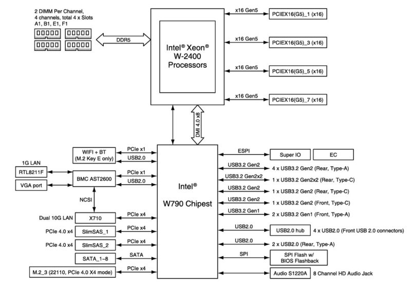 ASUS Pro WS W790E SAGE SE Intel Xeon W-3400 vs W-2400 Block Diagrams