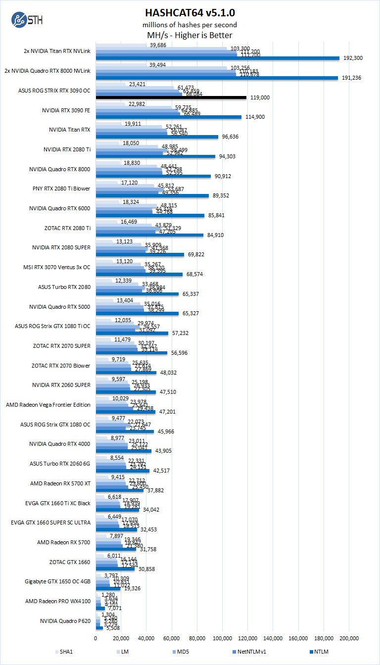 Hashcat can put a heavy load on GPUs. Again we see great GeForce RTX 3090 performance and the ASUS and NVIDIA cards are very close.
