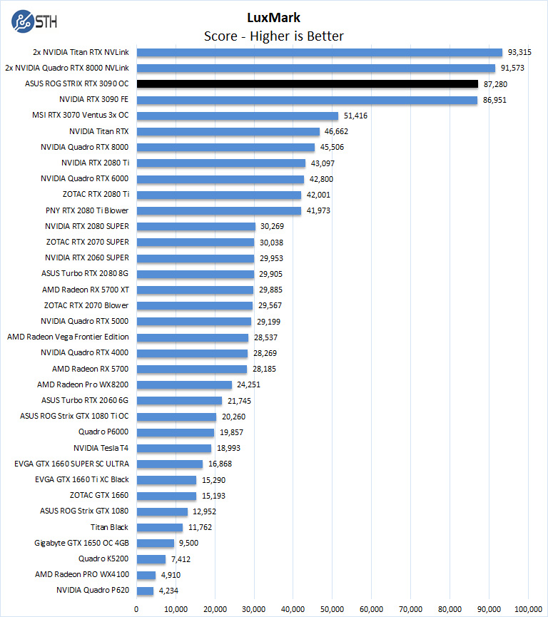 In LuxMark, a single ASUS ROG STRIX RTX 3090 OC can surpass our Titan RTX and Quadro RTX 8000. The figures are effectively even for the ASUS versus NVIDIA brand 3090’s here.