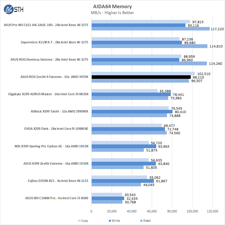 We have 4x 16GB Corsair Dominator Platinum RGB 3600MHz memory sticks on our test platform which boosts memory read speeds a great deal. The ROG Zenith II Extreme showed the fastest memory speeds yet, however, reads do not quite reach the top speeds we saw with some of the Intel Xeon W-3275 solutions.