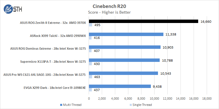 Here we see again the AMD Ryzen Threadripper 3970X dominates Cinebench R20 with ease. This is a test that performs well on AMD architecture which is why AMD uses it often in marketing.