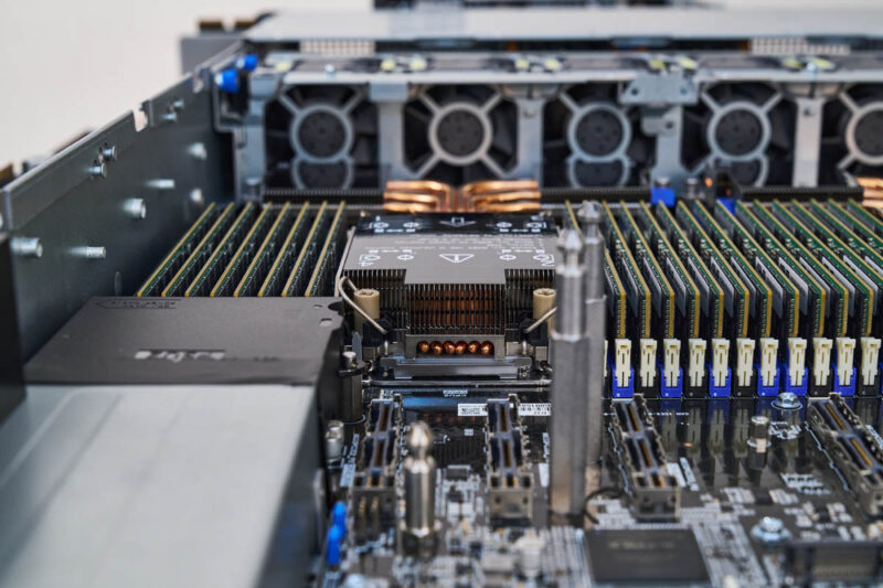 There is an airflow guide that keeps the bottom airflow for the CPUs, memory, and NICs, and then the top for the PCIe slots, which can be GPUs. That is why the airflow is bifurcated like this.