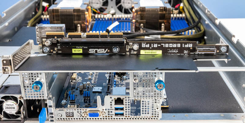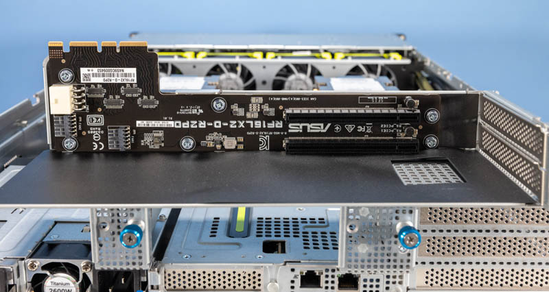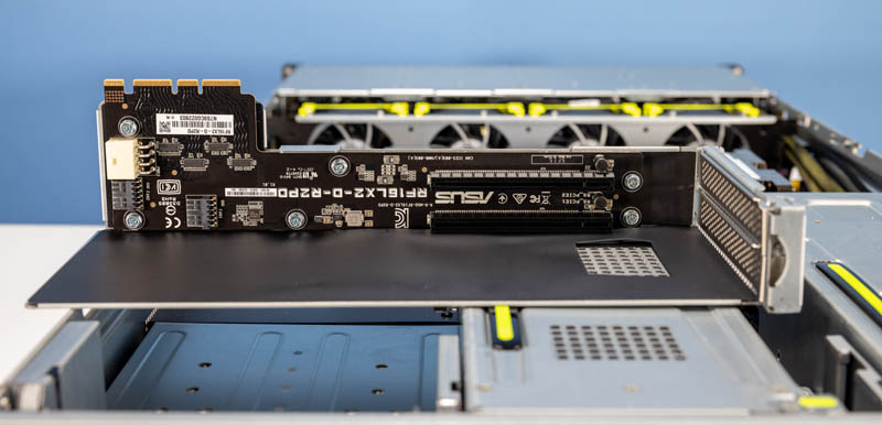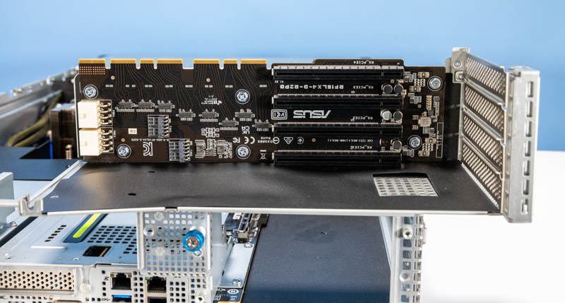 The right rear riser has a bit more going on. The top two slots (the riser is upside down in the photo below) can be x16/x0 or x8/x8. The bottom two slots can be the same or support an OCP NIC 3.0 expansion module that can be added to the system. We did not have this OCP NIC 3.0 expansion module since it is an option in the system. ASUS does this to deliver models that support 4x dual-slot GPU/ accelerator designs in the same chassis.