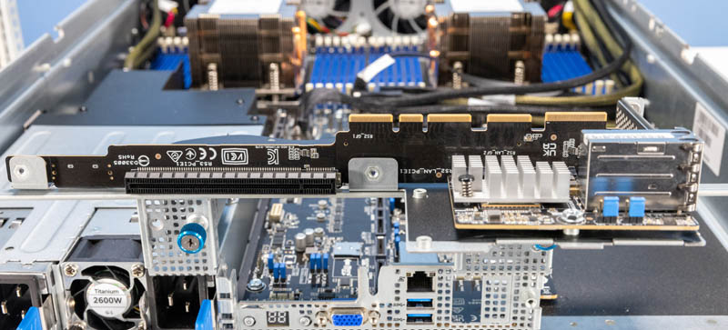 The PCIe situation is certainly interesting. The left rear riser has two PCIe Gen5 x16 slots. One can either use a single x16 slot, or run them both in PCIe Gen5 x8 electrical mode.