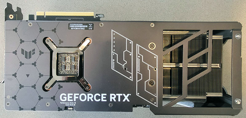 The back of the ASUS TUF 4090 OC is very close to the Strix, with a metal backplate covering the main PCB and a large vent area to allow for better airflow. We wish metal backplates were standard features on all GPUs.