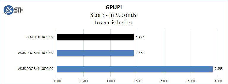 The ASUS ROG Strix 4090 OC completes this task in 1.431 seconds, while the TUF falls slightly faster at 1.427. We were able to also add the RTX 3090 in here compared to when we did the RTX 4090 Strix review.