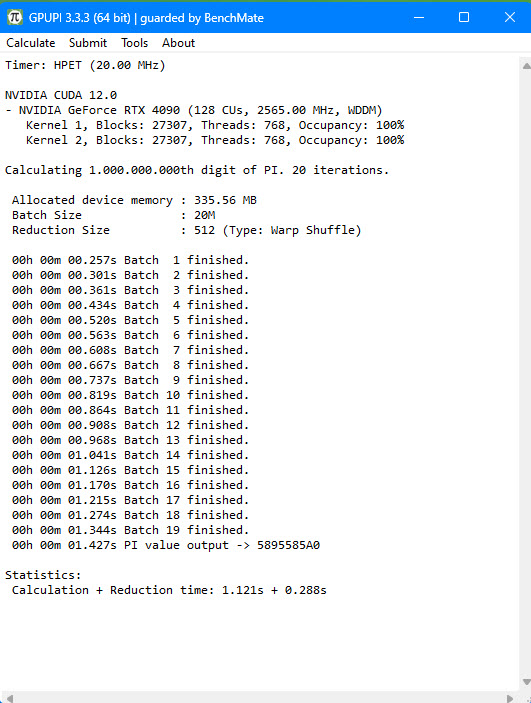GPUPI calculates the mathematical constant Pi in parallel by using the BPP formula and optimizing it for OpenCL and CUDA-capable devices like graphics cards and main processors.