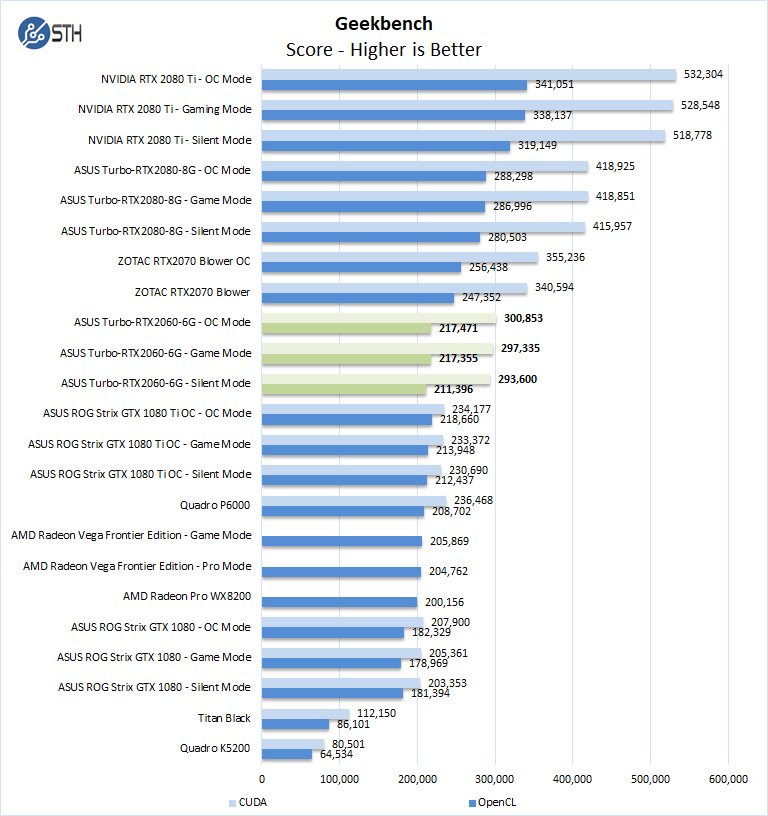 Our first compute benchmark, Geekbench, we see the ASUS Turbo-RTX2060-6G providing a solid showing in both CUDA and OpenCL results. The CUDA results are above the NVIDIA GTX 1080 Ti which is impressive given market segmentation of each generation.