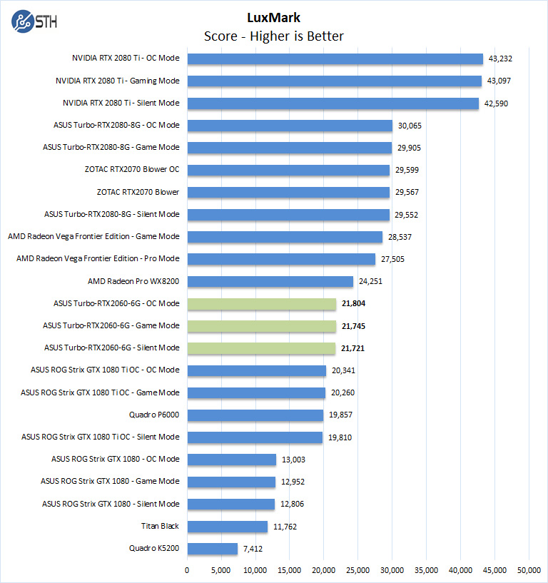 Here again, we can see a relatively tight stacking between the ASUS Turbo-RTX2060-6G GPU and the higher-end RTX 2070 offering. There is a bigger delta between the RTX 2070 and RTX 2080 than there is between the ASUS Turbo-RTX2060-6G and RTX 2070.