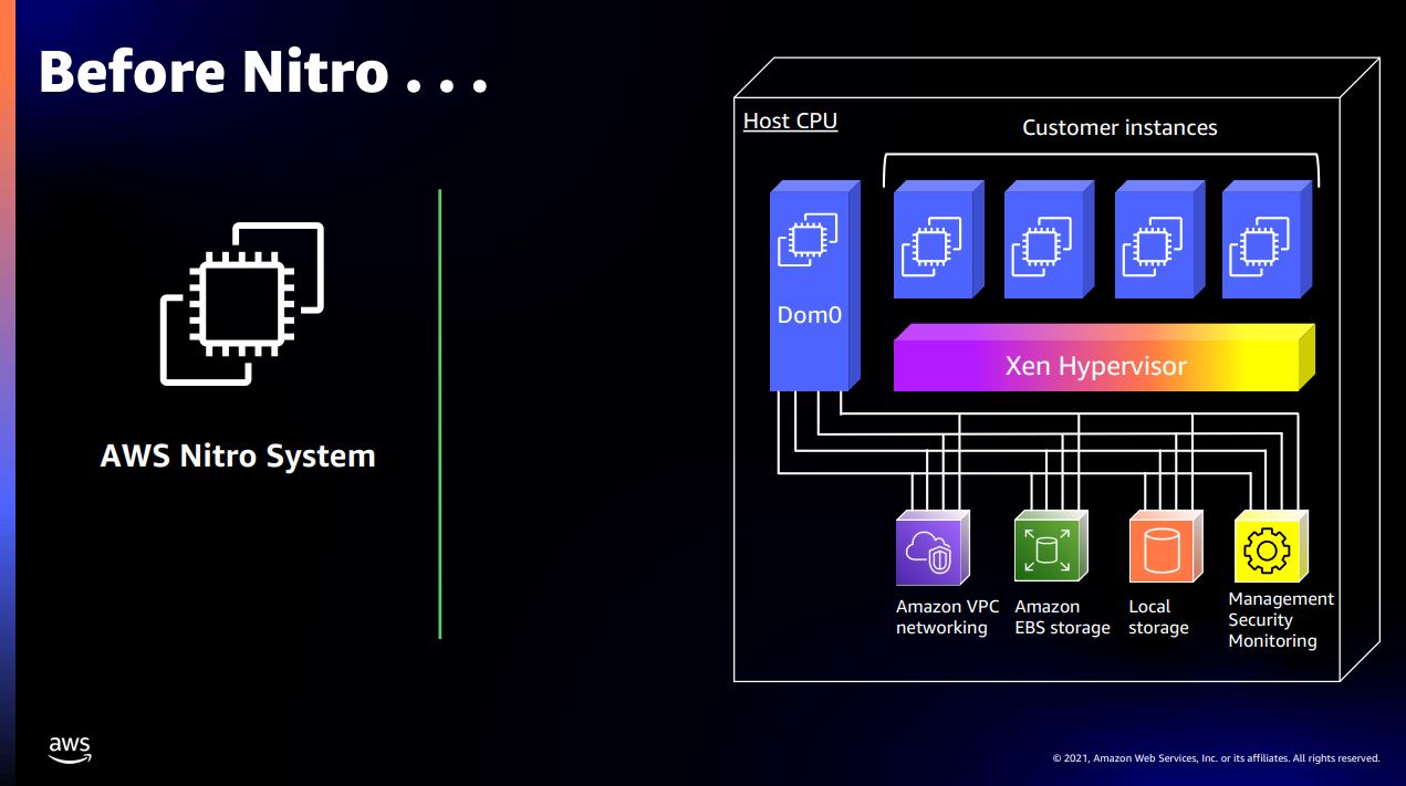 Prior to the Nitro system, AWS utilized the Xen hypervisor. The key here is that the VPC networking, EBS storage, local storage, and management functions all happen on the dom0 level. An easier way to look at this is that the same CPU that is being provisioned for EC2 instances is also having to handle the networking, storage, and management.
