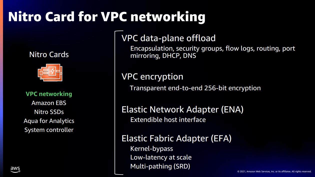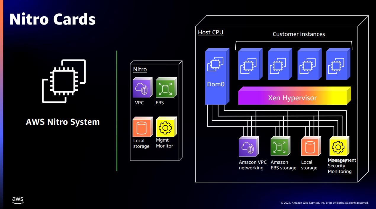 Nitro cards effectively are designed to take the VPC networking, EBS storage, local SSD storage, and the management controller functions from the hypervisor.