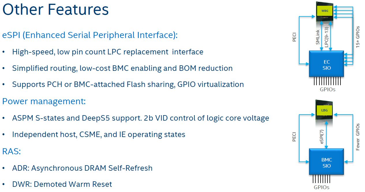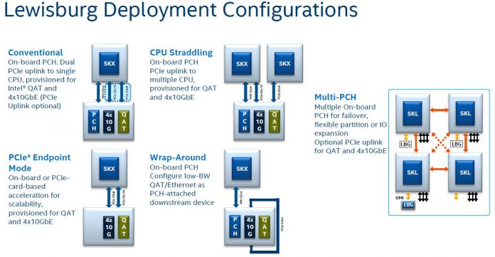 The new Lewisburg PCH family has some significant improvements. First, the back-haul to the CPU has essentially twice the bandwidth at a minimum, and up to several times more bandwidth depending on the system design. Second, for the first time up to 4x 10GbE can be integrated on the PCH, with RDMA capabilities. Third, a new and faster generation of QuickAssist is coming to the PCH. Finally, there is a new “Innovation Engine” that will be available to OEMs.