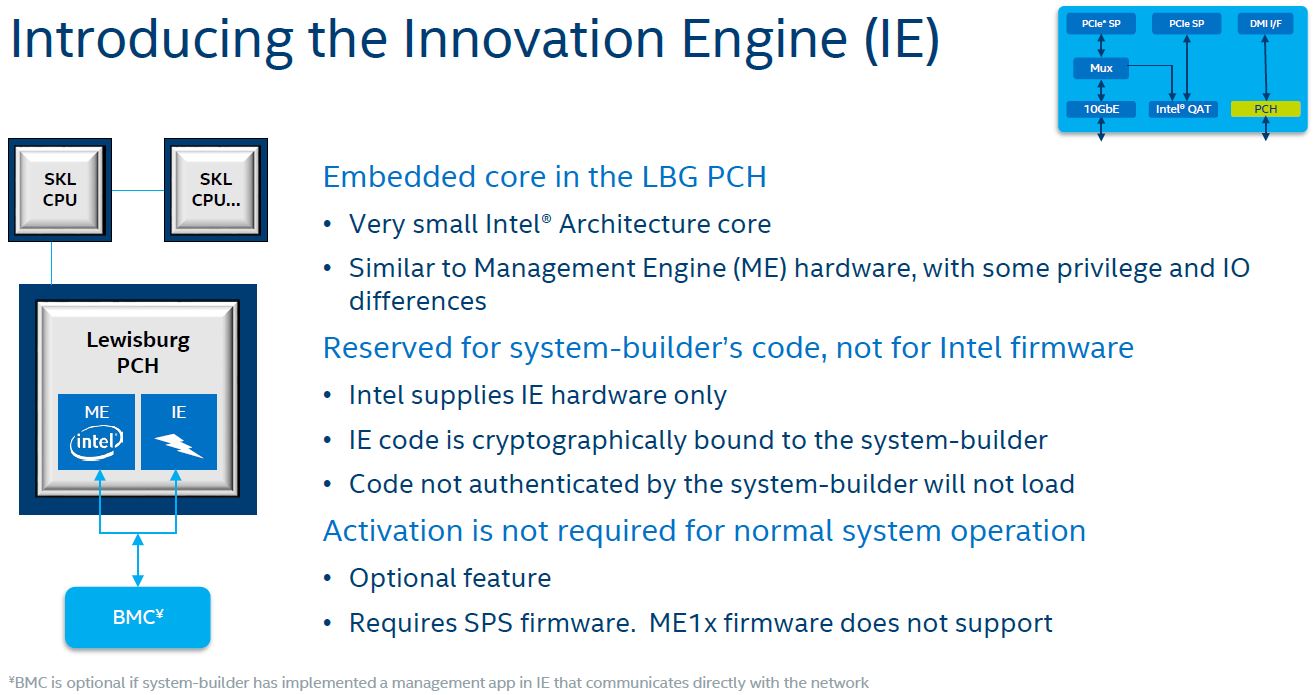 The Intel Innovation engine is a curiosity. It is a small x86 CPU engine that OEMs can leverage to add their own management capabilities.