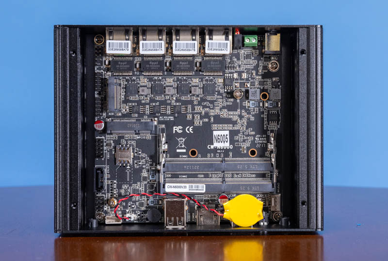 Inside we have a fairly familiar layout compared to the J4125 and N5105 units that we have looked at. Spoiler alert: this is also similar to the N5095 units. It is fairly easy to see these utilize the same motherboard. Opening up this panel shows the NICs and main serviceable components. The CPU is on the other side attached to a block that routes heat to the chassis for dissipation. Some users have reported better thermals by re-applying thermal paste to the CPU/ chassis interfaces. We did not have any stability issues running our units stock and we review these units in their stock forms.