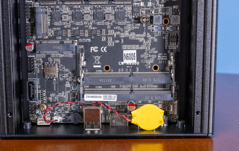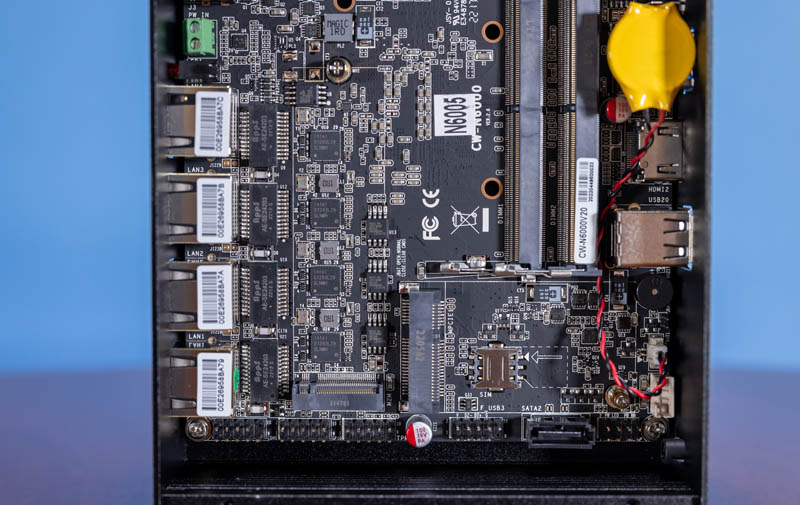 Inside we find the NICs to the left and the M.2 slot on the bottom for storage. Two SODIMM slots are in the top right. Here is a closer look at those with the “N6005” sticker.