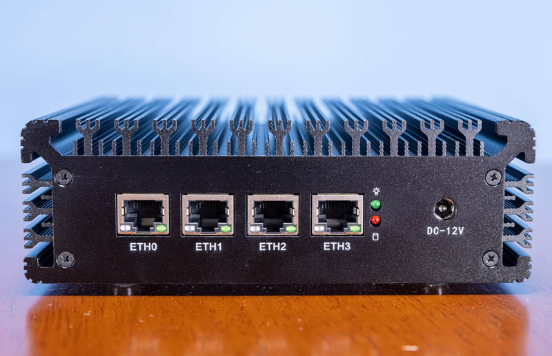 On the rear of the unit, we get perhaps the most exciting bits. There are four 2.5GbE ports powered by Intel i225-V B3 NICs. Two status LEDs for power and SSD activity are in the middle. Finally, there is a 12V power input. These use enough power as we will see that while you can power the J4125 units on PoE+ splitters, these will likely require stepping up to PoE++ splitters and infrastructure.