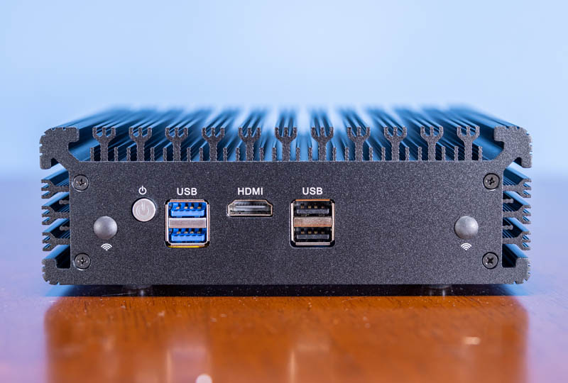 The system we purchased from KingNovy had the potential to be our favorite just because it is slightly larger and heavier due to the design of the heatsink chassis. On the front, we got a power button and two USB 3 ports. There is also a HDMI out port. This is the same as we saw on the N5105 systems.