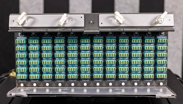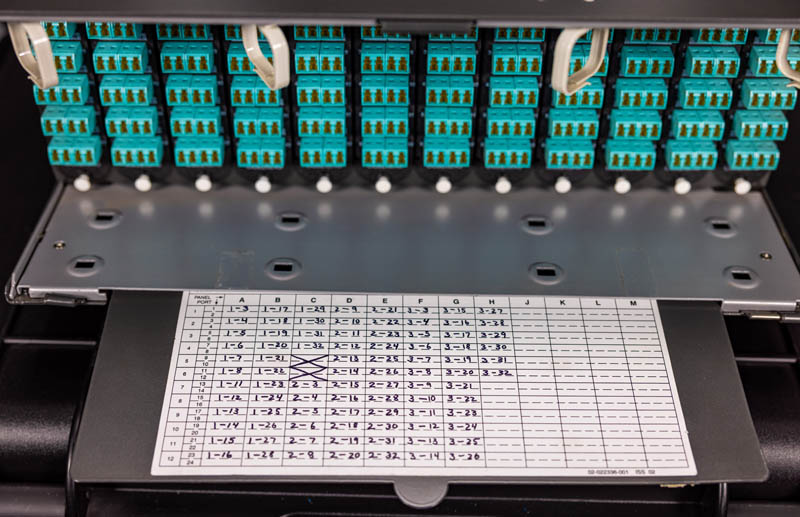 Keeping track of higher-density connections can be a challenge. As can labeling them given how dense this 288 fiber housing is. Corning has stickers that affix to a plate that slides out from the bottom of the unit that allows for labeling of the connections without having to disturb fibers while updating labels.