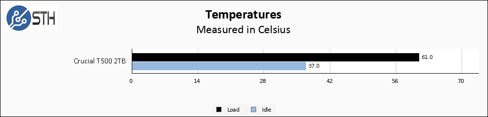 Crucial T500 2TB Temps ChartThe T500 is a pretty cool-running drive, topping out at 61C. Considering this drive is operating without a heatsink, this is one of the coolest running Gen4 drives I have tested, and certainly one of the best results for a 7000 MB/s drive. For all but the most extreme environments and workloads, I cannot imagine you will need a heatsink.