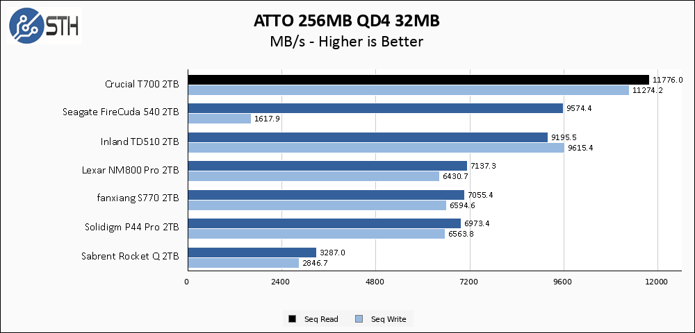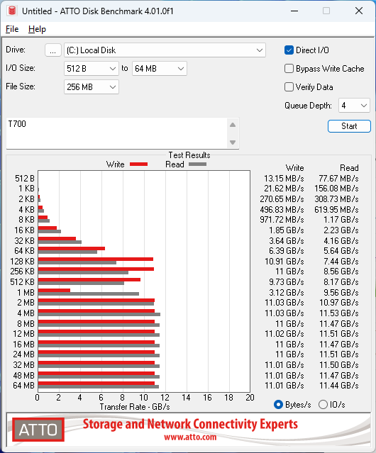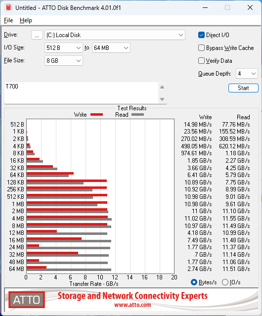 ATTO results for Gen 5 drives have not been perfectly consistent; if you look at my chart you can see the FireCuda 540 struggled here a bit. I eventually found that performance issue to be related to the percentage of the drive that was used, and you can read my review if you want to see that illustrated. Regardless, the T700 performs very well here.